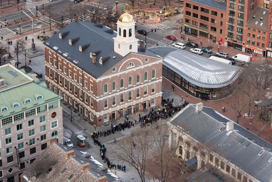 One of the wealthiest Boston merchants Peter Faneuil proposed to mark his success by building a central food market in his hometown in 1742. The Hall included an open market and a meeting space suitable for town gatherings. The hall, named for Faneuil, was built on land gained by the filling of the small cove near the ancient and dilapidated town dock. In 1761, Faneuil Hall burned. Two years later it was rebuilt–this time financed by a public lottery. Faneuil Hall soon became the focus of revolutionary activity in Boston. At times protest meetings held at the Hall spilled over into incidents of violence on the streets. Under the leadership of James Otis, Samuel Adams, Dr. Joseph Warren and other “Sons of Liberty,” debates led to opposition to the Sugar Tax of 1764, the Stamp Act of 1765, and other British political maneuvers. In December of 1773 sessions took place here concerning a newly arrived consignment of tea and the tax to be paid on it. Faneuil Hall soon became know as America’s “Cradle of Liberty.”